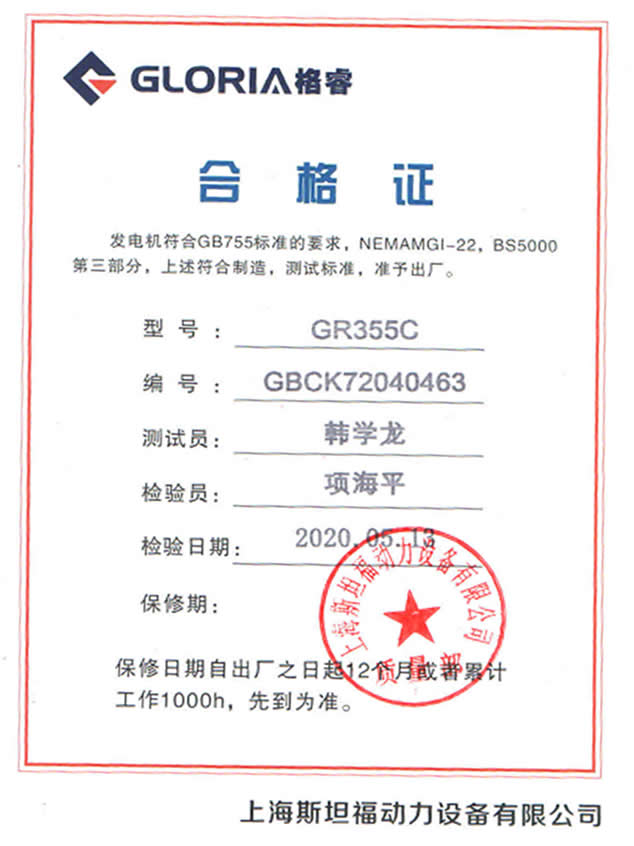 开云(中国)-格睿电机出厂时资料袋都附带有该发电机型号出厂编号出厂日期并盖有开云(中国)-质量部印章的合格证,核准参数与发电机铭牌一致。